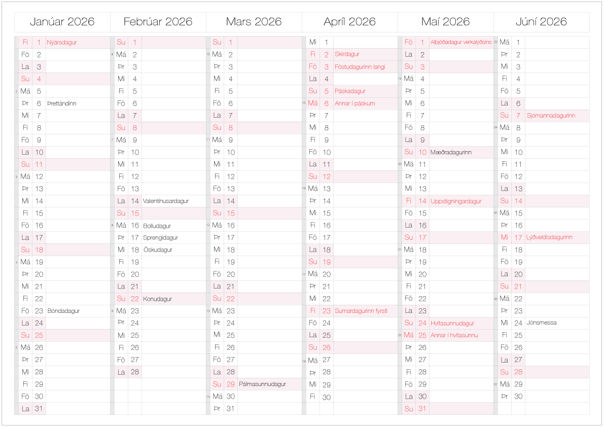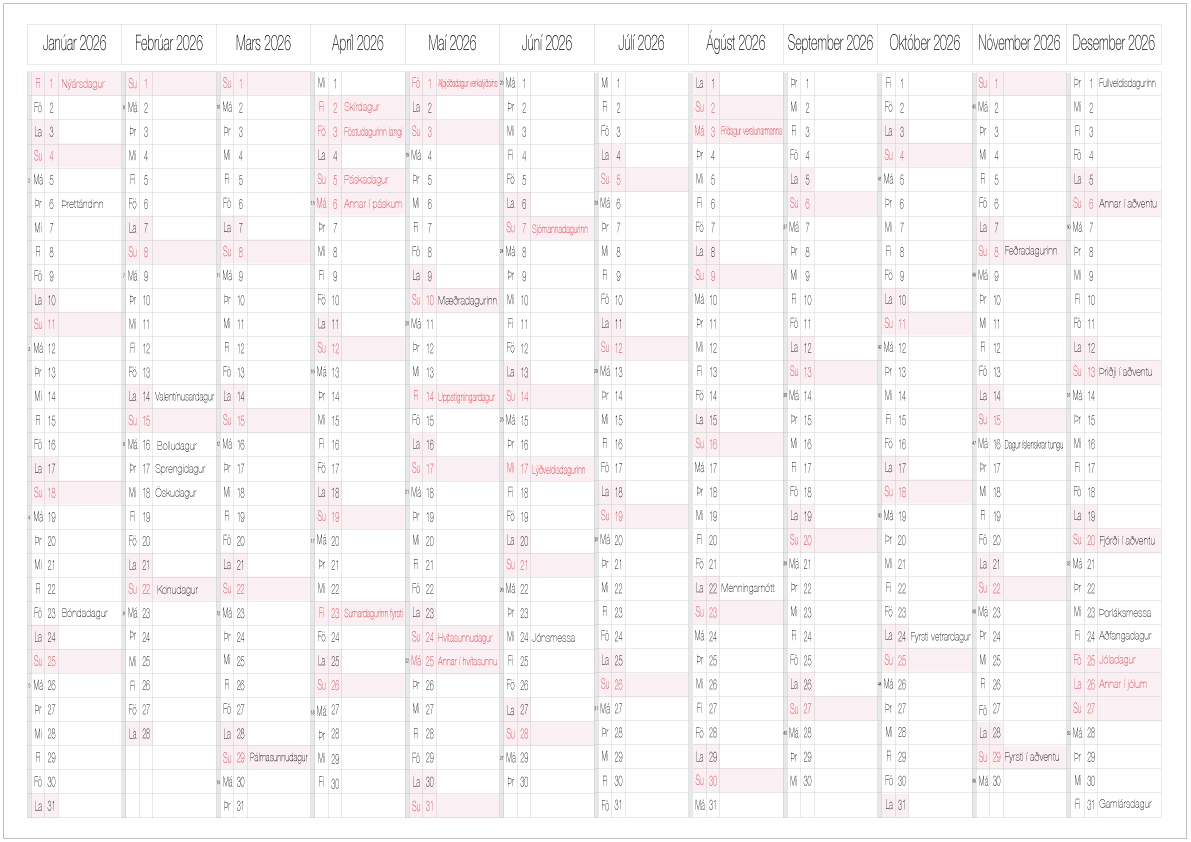 Veggdagatöl - skólaárið (ágúst - júlí) | Stærðir A5, A4 og A3
